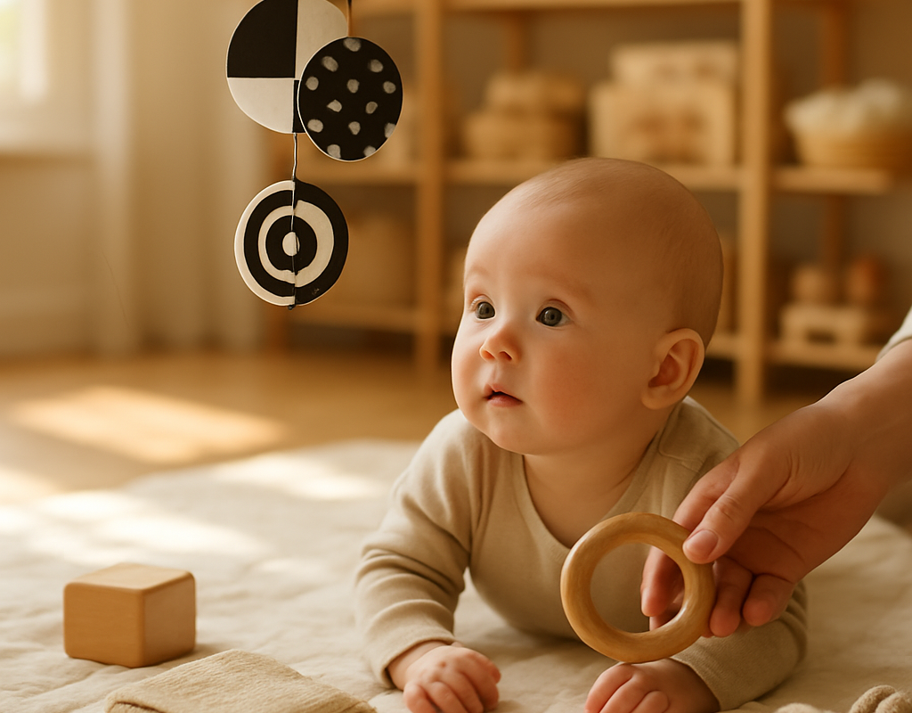 • Kontrastmobiles und Bücher: Ideal für Neugeborene. Schwarz-weiß und auffällige Formen sind leichter zu fokussieren. Hänge ein Mobile in sicherem Abstand über die Krabbeldecke — so startet das visuelle Training schon beim Spielen.
